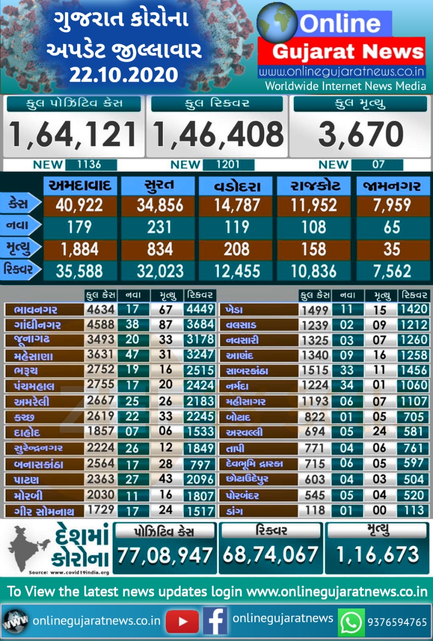 Deprecated: Optional parameter $depth declared before required parameter $output is implicitly treated as a required parameter in /home/u203038138/domains/onlinegujaratnews.co.in/public_html/wp-content/themes/newsup/inc/ansar/newsup-custom-navwalker.php on line 43 કોરોના અપડેટ 22.10.2020 - online gujarat news